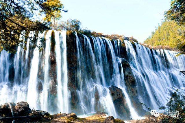 珍珠滩瀑布的彩虹当然也以秋日最佳,它总是出现在上午十点半左右,气势比诺日朗的更大。运气好时,还能见到彩虹上面那一轮稍微暗淡的霓,虹和霓中间呈暗灰色,把虹霓的七色衬托得更加鲜艳。“赤橙黄绿青蓝紫,谁持彩练当空舞”,你儿时就背得滚瓜烂熟的诗句,不经意间从记忆深处跳将出来,这正是眼前奇的写照。如果你意犹未尽,或者还会即兴吟诵出感情色彩更加浓郁的佳句来。